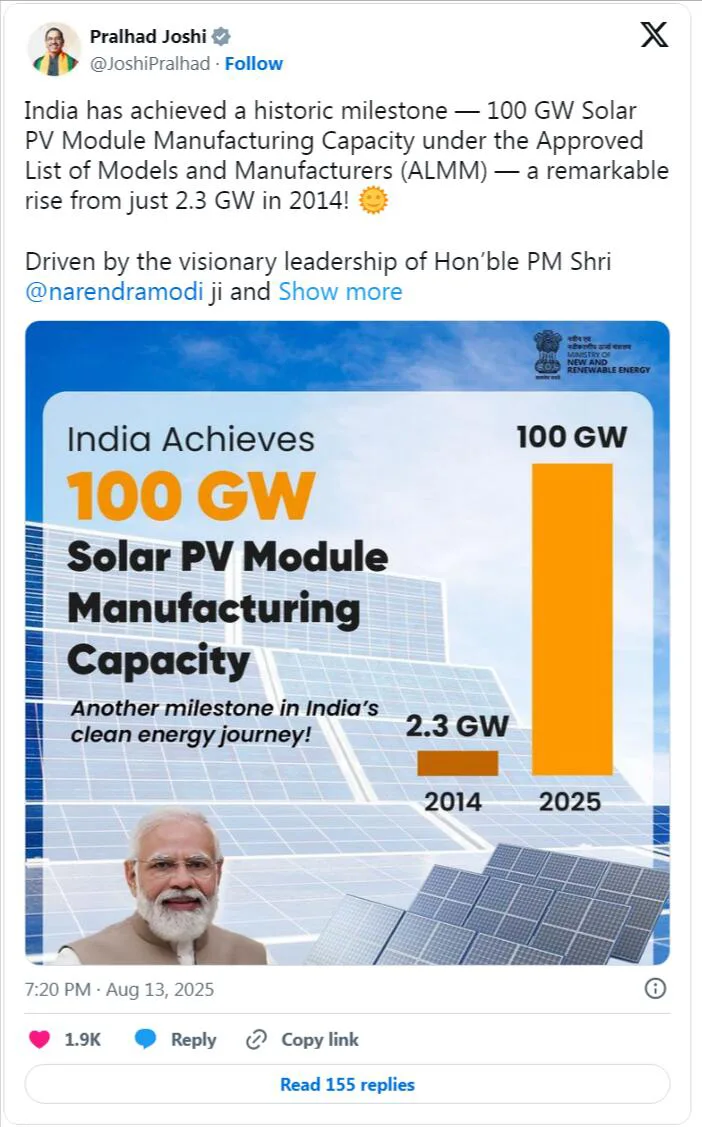 Прахад Джоши, министр Индийского Альянса по новым возобновляемым источникам энергии, подчеркнул это достижение, заявив: «Индия достигла исторической вехи - в соответствии со Списком одобренных моделей и производителей (ALMM) мощность производства солнечных фотоэлектрических модулей достигла 100 гигаватт, что значительно больше, чем 2,3 гигаватта в 2014 году! Под дальновидным руководством премьер-министра Нарендры Моди и движущей силой преобразовательных инициатив, таких как В рамках Схемы стимулирования производства эффективных солнечных модулей (PLI) Индия строит сильную и самодостаточную экосистему производства солнечной энергии. Это достижение ускорит темпы на пути к Атманирбхар Бхарату и поможет Индии достичь своей цели по достижению 500 гигаватт мощностей по производству неископаемой энергии к 2030 году.